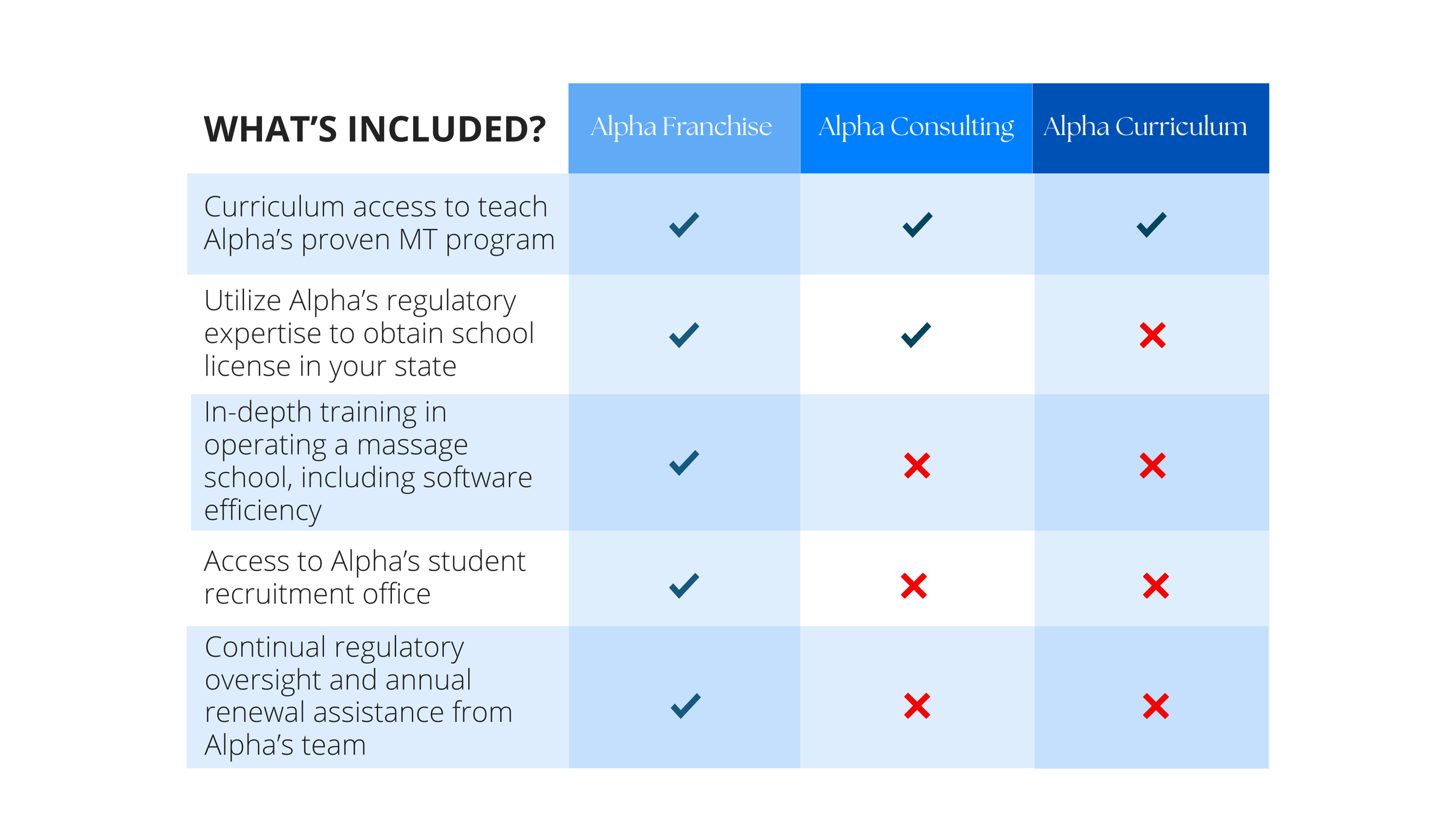 Alpha’s team will complete the initial application for you to open your school. We will become your regulatory specialist. We will do all the research and put in all the leg work to get you certified to operate a massage school in your state. Alpha’s team has worked with post-secondary education boards in Florida, Georgia, Virginia, New Jersey, Delaware, and more. We’ll train you on subsequent renewals, staying informed so you stay compliant. This includes space, advertising, staffing, record-keeping, curriculum, and more.